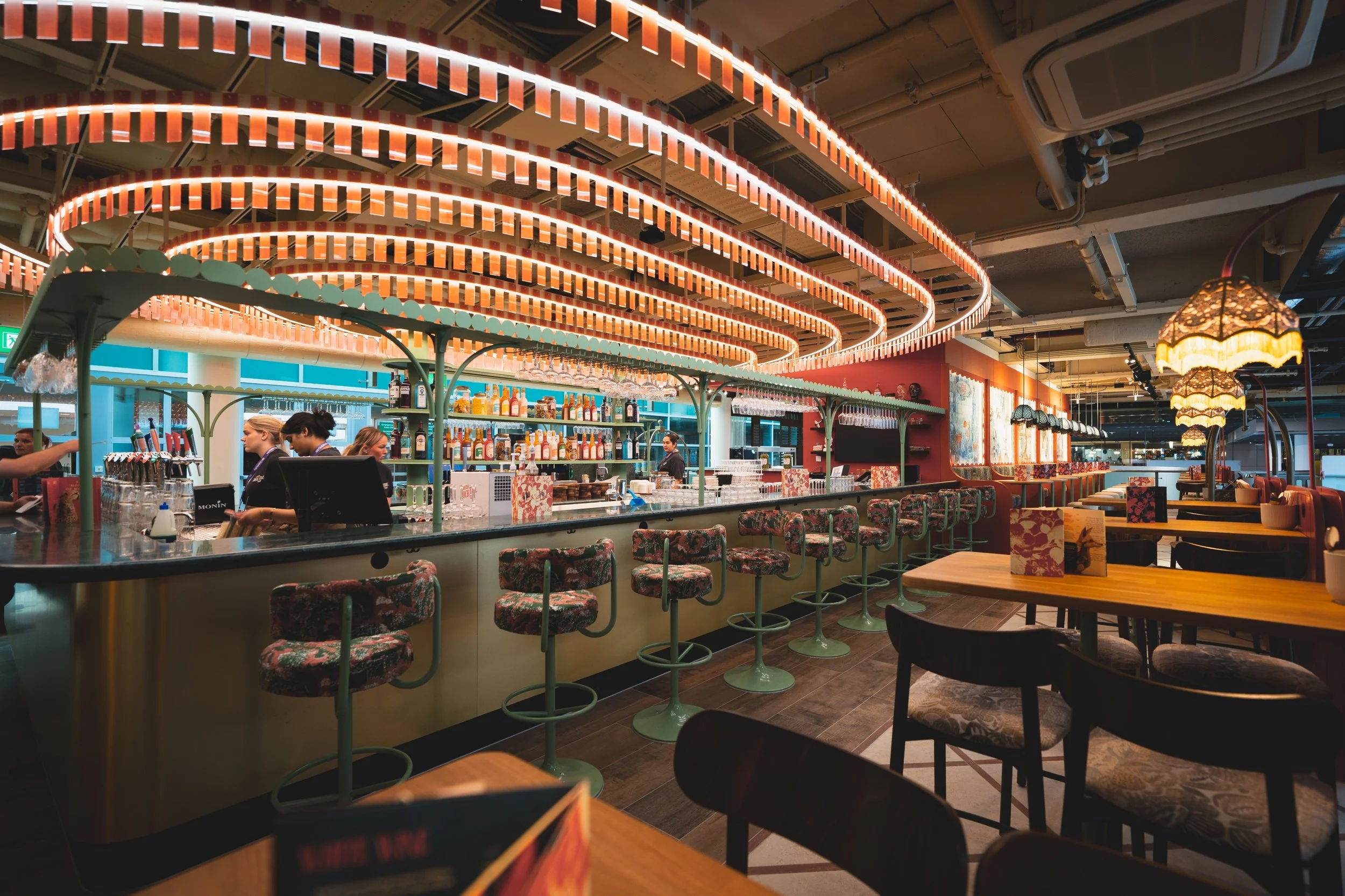 Unprecedented airport bar concept, with a down-town feeling of the world’s most captivating and buzzing cities. The Wanderer tells a story of an extravagant traveler, through exotic dishes, colourful patterns and a curated selection of artefacts. A concept special is the inclusion of native branding elements in cooperation with leading beverage suppliers.